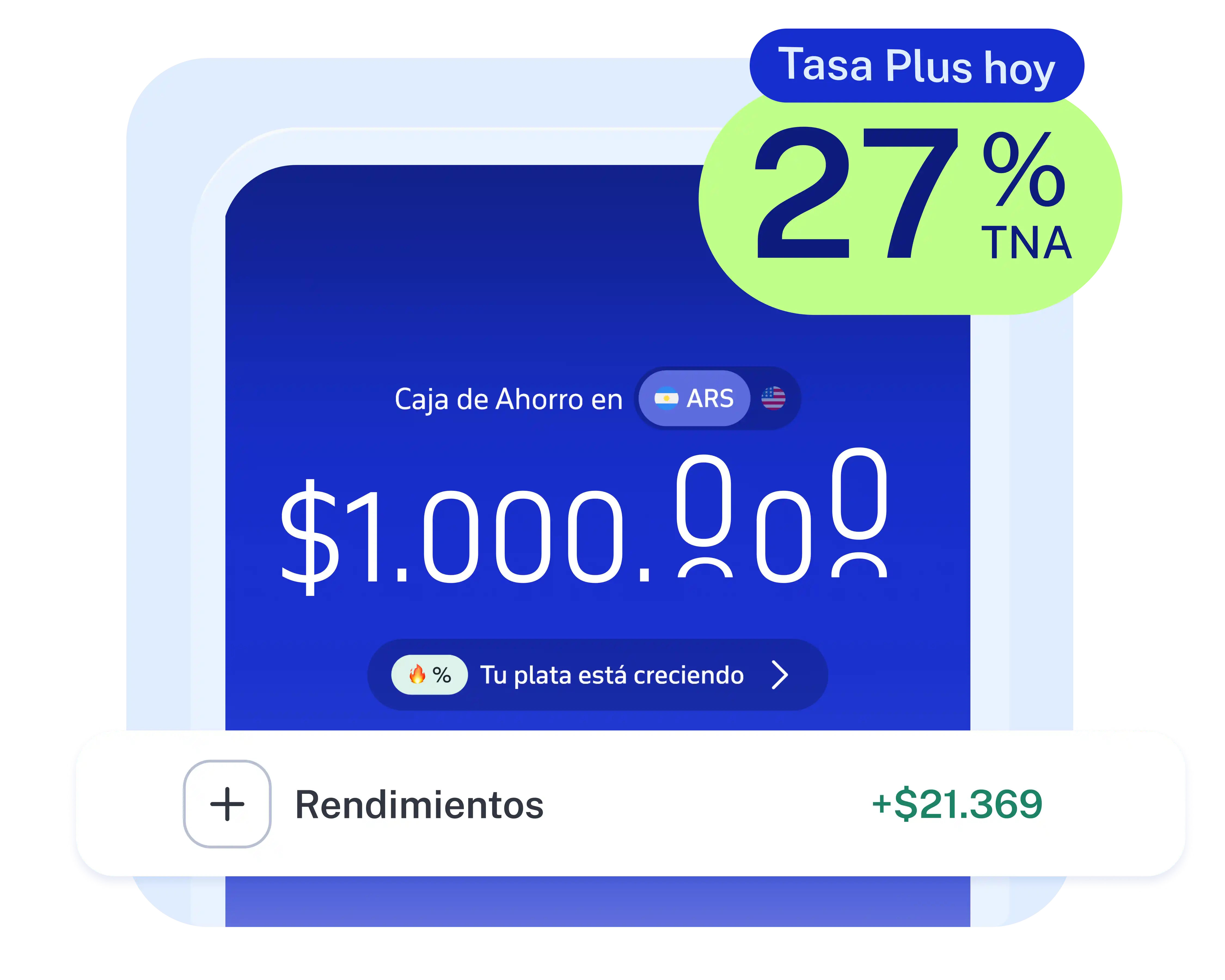 Tus pesos rinden todos los días un 21% TNA. Si sumás $250.000 en ciertas operaciones, tu tasa sube hasta 24% TNA en el momento. Si sumás $500.000, sube hasta 27% TNA. ¡Recibís los rendimientos actualizados durante todo el mes! Acordate que las tasas son vigentes a hoy y pueden variar.