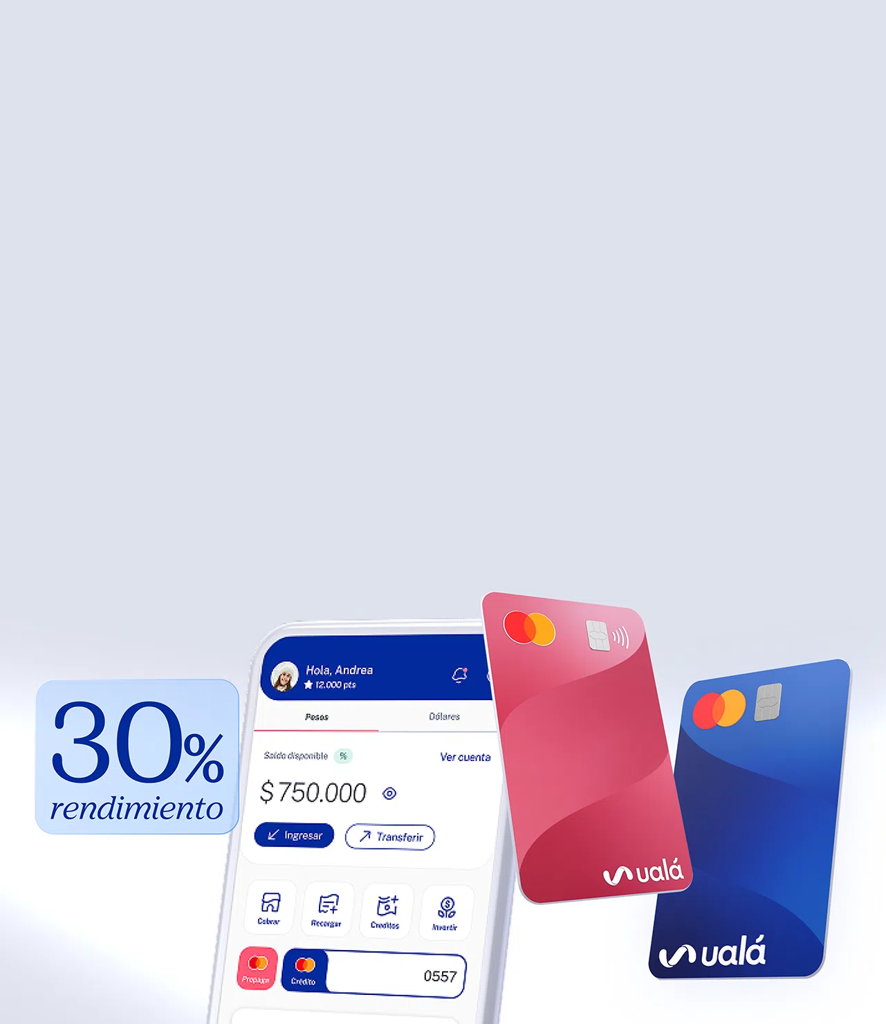 Tus pesos rinden todos los días un 22% TNA. Si sumás $250.000 en ciertas operaciones este mes, el mes que viene tu tasa sube hasta 23% TNA. Si sumás $500.000, sube hasta 26% TNA. Acordate que las tasas pueden variar.